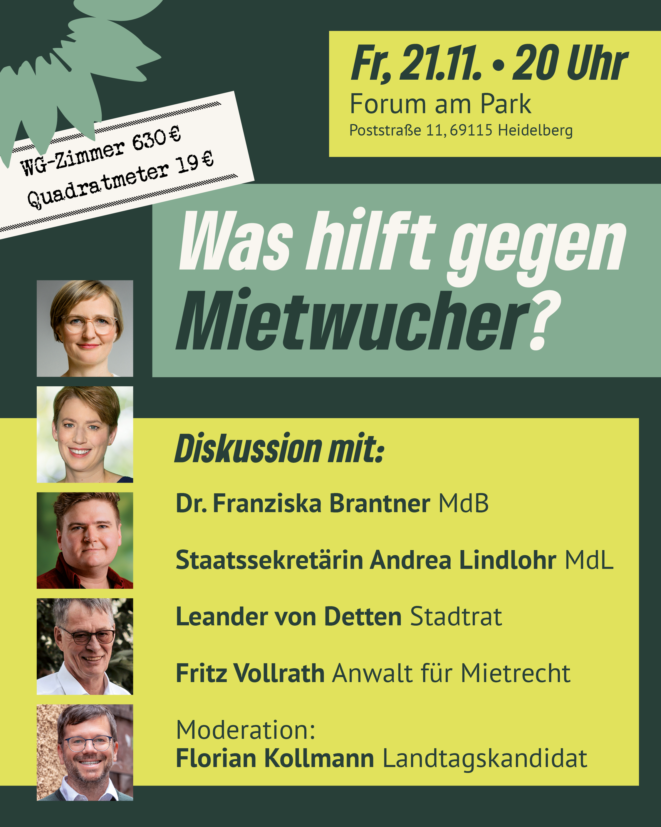 Impulse und Diskussion: Wie kann bezahlbarer Wohnraum entstehen? Was können Bund, Land und Kommune gegen zu hohe Mieten tun? Welche rechtlichen und praktischen Möglichkeiten gibt es, um unrechtmäßige Mieten zu stoppen? Und was können Menschen tun, die selbst von Mietwucher betroffen sind?
